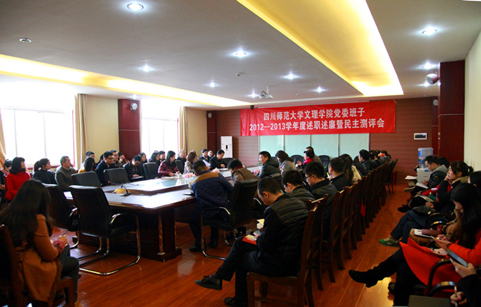 11月29日,学院党委班子2012-2013学年度述职述廉暨民主测评会在二校区第二会议室召开。四川师范大学党委第五干部考核组组长、机关一总支书记、监察处副处长杨渝君一行三人莅会指导。学院党委书记高华锦作党委班子及个人履职廉政情况报告,院长唐小林代表学院行政班子介绍学院党委发挥政治核心和保障监督作用情况,院党委副书记邹昌淑、骆云英作个人履职廉政情况报告。在家的学院行政班子成员、院内各基层党组织书记、党群部门全体工作人员及教学单位代表共80余人听取述职并进行书面测评。