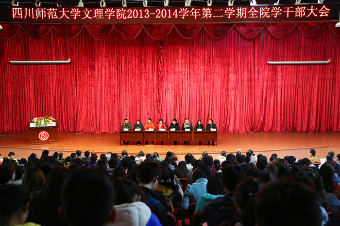 3月6日中午12点30分,四川师范大学文理学院2013—2014学年第二学期全院学生干部大会在一、二校区同时举行。学院党委副书记邹昌淑、骆云英分别莅临一、二校区大会。