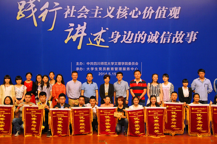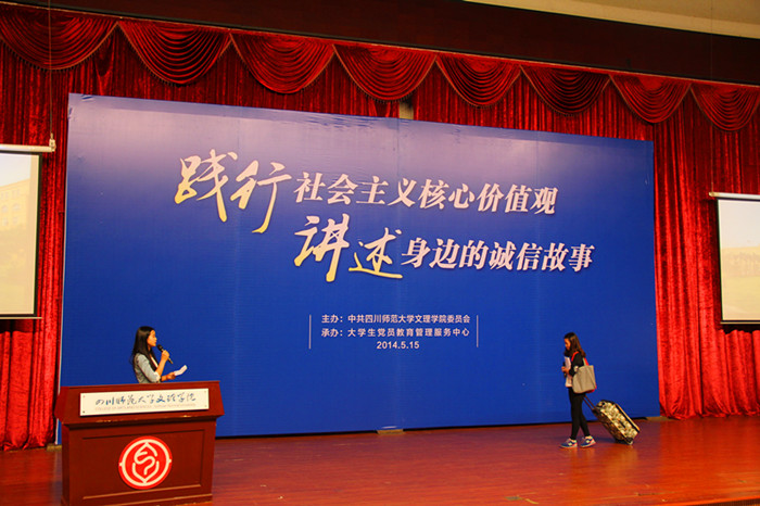 故事会既讲述了身边诚信的人和事,也通过视频学习了全国诚实守信模范人物的先进事迹。“奉献千秋唯觉少,一片赤心可对天。他以四川人特有的勤劳与朴实,一心为公、全心全意为师生服务,他把心中所有的温情化作无数份爱心奉献给学校,把全部的心血都浇灌在教育发展事业的沃土上……”政治与法律学院学生党员深情讲述了该院院长程思进教授兑现教育报国承诺的事迹。演艺学院选送的《男孩留下的道歉信》、信息技术学院选送的《诚信安全网络》、传媒学院选送的《言必行,行必果》、文学院选送的《出租车司机的诚信》、外国语学院选送的《诚者信能》、经济学院选送的《诚信无小事,温暖他人心》、教育学院选送的《诚信的救赎》都给师生留下了深刻印象。感动中国人物“信义兄弟”、陈俊贵及全国道德模范吴恒忠坚守诚信的事迹,使师生摄取了丰富的精神之钙,接受了一次真情、善良、感恩的教育与洗礼。