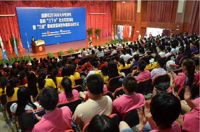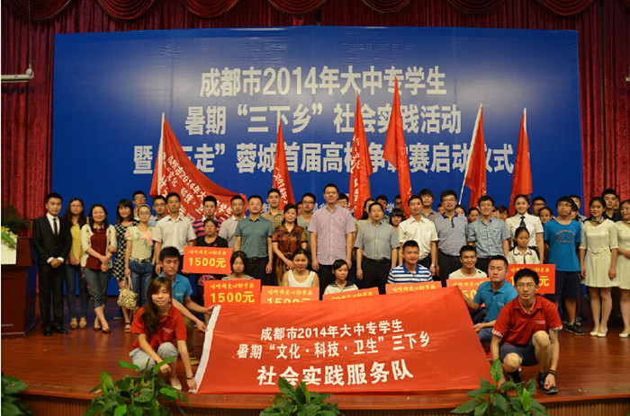 本次活动由共青团成都市委员会、成都市学生联合会主办,共青团成都市金堂县委员会、共青团成都文理学院委员会协办。在启动仪式现场,邓忠发表了热情洋溢的致辞,骆云英介绍了学院组织开展暑期社会实践活动情况,来自西南民族大学的学生代表向全市参与暑期社会实践的同学们发出倡议和号召,罗静为大家介绍了2014年大中专学生暑期“三下乡”社会实践活动的整体部署情况,并对各高校开展社会实践活动提出了要求。