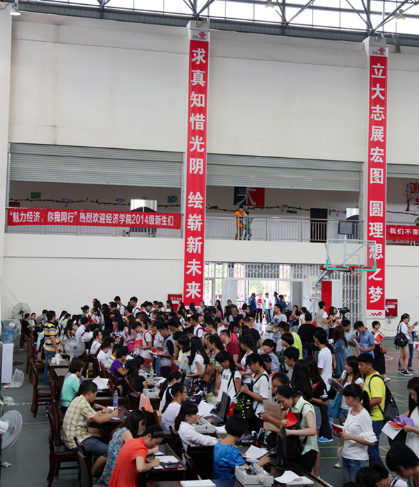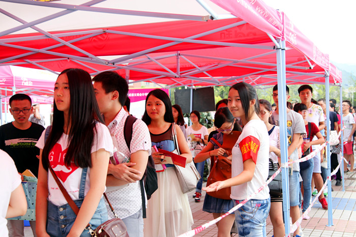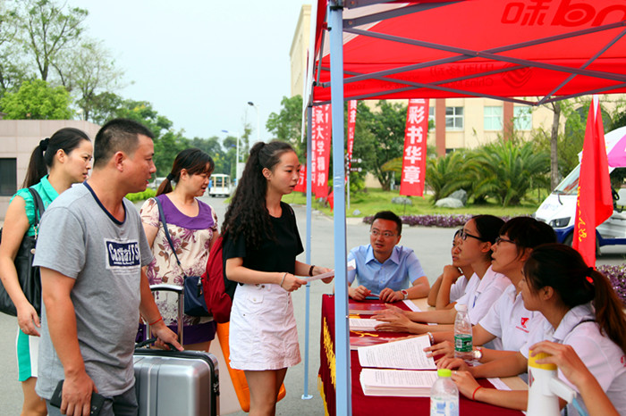 一道道彩虹门横跨在学校和教学楼门口,欢迎的标语让新同学倍感温暖。彩旗、海报、展板、迎新指南、新生家长休息室……清新的校园,温馨的问候,贴心的服务,让整个校园呈现出一派欢乐祥和的氛围。从下午2点到晚上6点30分,提前报到的新生陆续到报到点签到办理各项手续。学生志愿者服务团队轮流值班,接待新生,为新生和家长解答疑问,报到点现场人流如织,秩序井然。