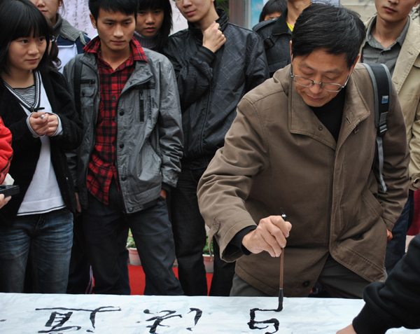 现场展示环节,文传系师生即兴创作。毛庆教授、黄泽铣副教授现场给予学生指导,并挥笔题写了“道法自然”等深具人生哲理的箴言。开幕式历时近一个小时,与会领导同参展作品作者合影留念。