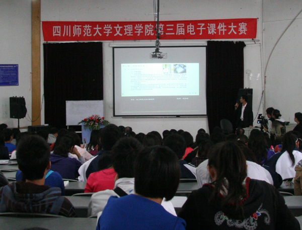10月15日上午8:30,由我院教务处主办的第三届电子课件大赛在第二教学楼多功能厅顺利举办。电子科技大学黄晋博士,西南石油大学曾洁教授,四川师范大学唐稷尧博士、欧震博士、陈国典教授、厥敏副教授、文致远副教授,四川师范大学文理学院赖先朴教授、胡念青教授担任评委到场指导。
