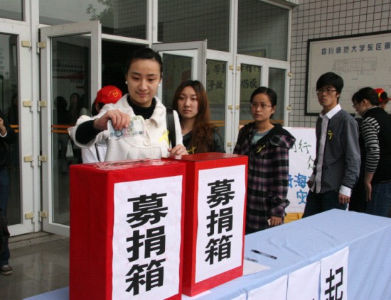 4月22日,我院在二教广场举行了集体捐款活动。院长唐志成、院党委书记高华锦等学院党政领导和教职工、学生代表一起参加了募捐活动。我院文传系400余名学生还特意佩戴黄丝带祝福灾区人民平安。学院师生踊跃捐款,同学们拿出平时积攒的零花钱,为灾区同胞献出了自己的一份爱心。此次共捐款60165.4元。目前,捐款还在陆续进行中。