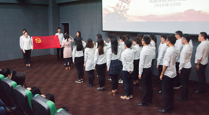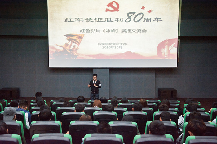 10月26日,传媒学院在艺术楼107放映厅举办红军长征胜利80周年纪念活动——红色影片《冰峰》展播交流会。传媒学院第一学生党支部书记章婷、第二学生党支部书记胡佳、分团委书记韩杰及传媒学院辅导员和全体学生党员参加活动。