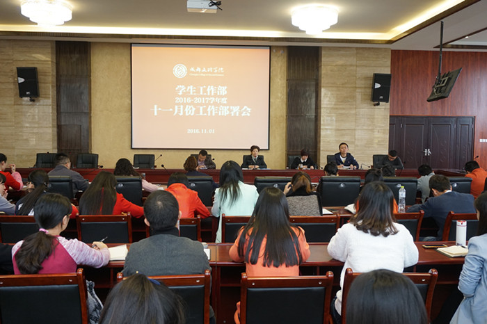 为提炼十月份工作经验,高效推进十一月份工作进程,11月2日下午15时,学生工作部于学工楼209会议室召开2016-2017学年度十一月份工作部署会。党委副书记骆云英,院务委员、学工部部长王亚军,团委副书记郑巍巍,学工部副部长刘原媛,学工部部长助理牟金星,部长助理余天好及各学工办主任出席本次会议,学工系统全体辅导员到场参加。会议由王亚军主持。