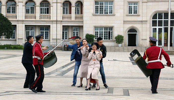 演练模拟一场突发的绑架事件。罪犯打伤保安,强行冲入校园劫持了两名女学生,并释放携带的可燃危险气体。在谈判过程中,学院领导自愿替换被挟持的学生,罪犯在得到赎金准备逃逸的过程中,被埋伏在校门口的警察制服,人质得以解救。整个演练过程策划精密,场景布置真实,组织井然有序。