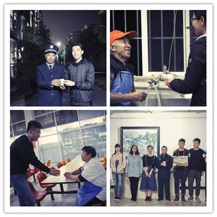深夜,艺术团的同学们将制作好的奶茶和咖啡送到学生公寓宿管人员,夜间巡逻执勤的保安,食堂工作人员,后勤、学工部24小时值班室的老师等夜间工作的文理人手中,并表达了对他们辛苦坚守岗位的感谢与敬意。面对这突然的“惊喜”,老师和叔叔阿姨们都感到十分温暖与欣慰,在表示感谢的同时还不忘提醒同学们注意安全。