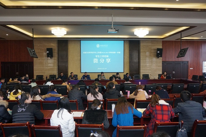 “微分享”在会计学院学生心理危机干预“班级晴雨表”和“寝室点到口令”中拉开帷幕;信息技术学院“i先锋,进班级”活动,建立学生党员班主任制度,发挥优秀学生的榜样示范作用;传媒学院探索“互联网+辅导员”学习模式,加强办公室文化建设;文学院制定资助评分准则,以明确的指标来指导辅导员和评议小组开展资助评定工作。各学院结合自身工作实际,依次分享亮点和经验,“微分享”现场反响热烈。