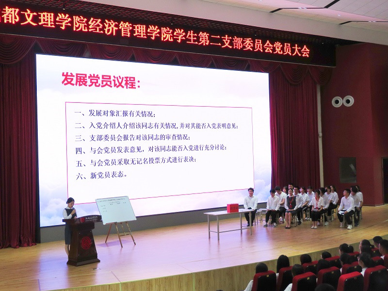 5月11日中午12时20分,经济管理学院党总支在学校文理讲堂召开了“讨论接收预备党员的支部大会”观摩会,本次观摩会由中共成都文理学院经济管理学院学生二支部委员会承办,由学生二支部书记赵钰主持。学院党总支书记李江、各党支部书记和全院师生党员到场参加,本学期重点发展对象、2020级青年学生理论学习小组成员列席观摩会。