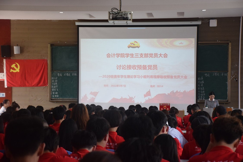5月7日中午12时20分,会计学院学生一支部、学生二支部和学生三支部分别在主教学楼B114、C114、B214教室召开讨论接收预备党员大会观摩会。学生一支部书记李晓卫、学生二支部书记陈琴、学生三支部书记杨佳以及全体党员参加了大会,2020级青年学生理论学习小组全体成员观摩了本次大会。