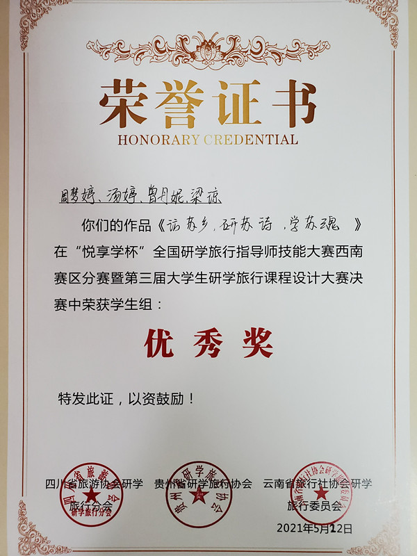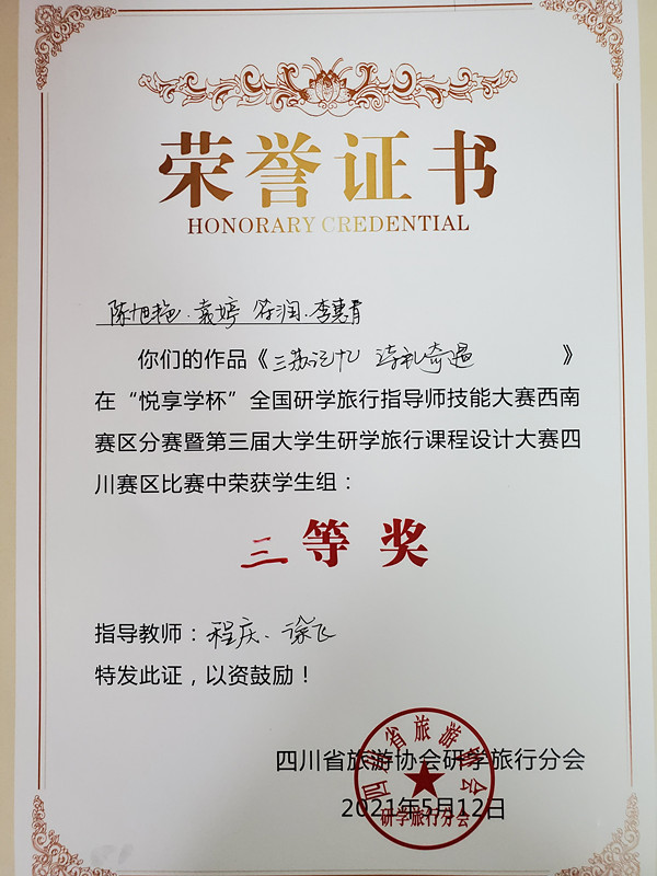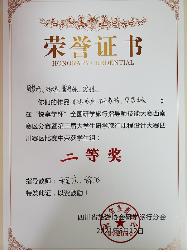 成都文理学院经济管理学院组建了两支旅游管理专业学生队伍参加此次比赛,由我院副院长程庆、旅游管理教研室副主任徐飞担任指导教师。经过激烈的角逐,周梦婷、汤婷、曾丹妮、梁琼四位同学的作品《话苏乡,研苏诗,学苏魂》获四川赛区二等奖,并在决赛中获优秀奖;由陈旭艳、袁婷、符润、李慧青四位同学的作品《三苏记忆·诗礼奇遇》获四川赛区三等奖。
