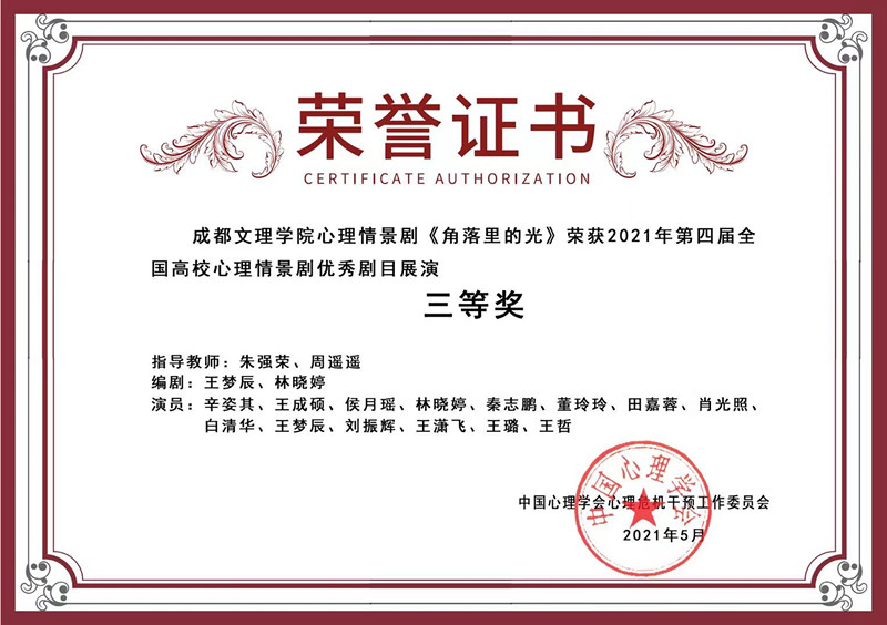 由我校大学生心理健康辅导中心教师周遥遥和传媒与演艺学院教师朱强荣共同指导的心理情景剧《角落里的光》,在全国320所高校的323件参赛作品中脱颖而出,荣获全国高校心理情景剧大赛三等奖。