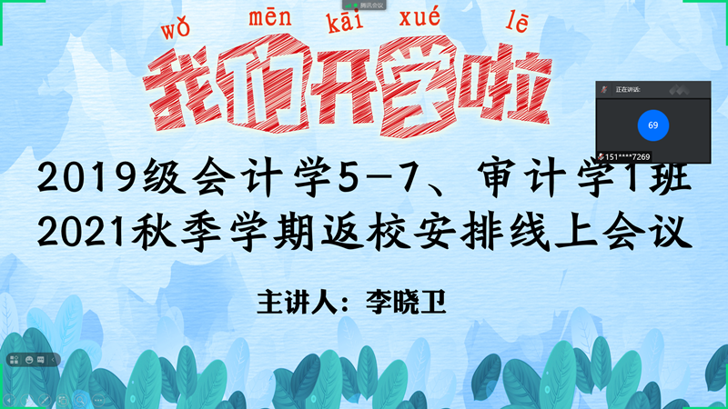 为全面落实秋季学期开学和疫情防控工作,确保新学期开学工作平稳有序地推进,8月20日—8月24日期间,会计学院辅导员通过钉钉、腾讯会议等线上形式在全院各班级中召开2021年秋季学期开学返校主题班会。